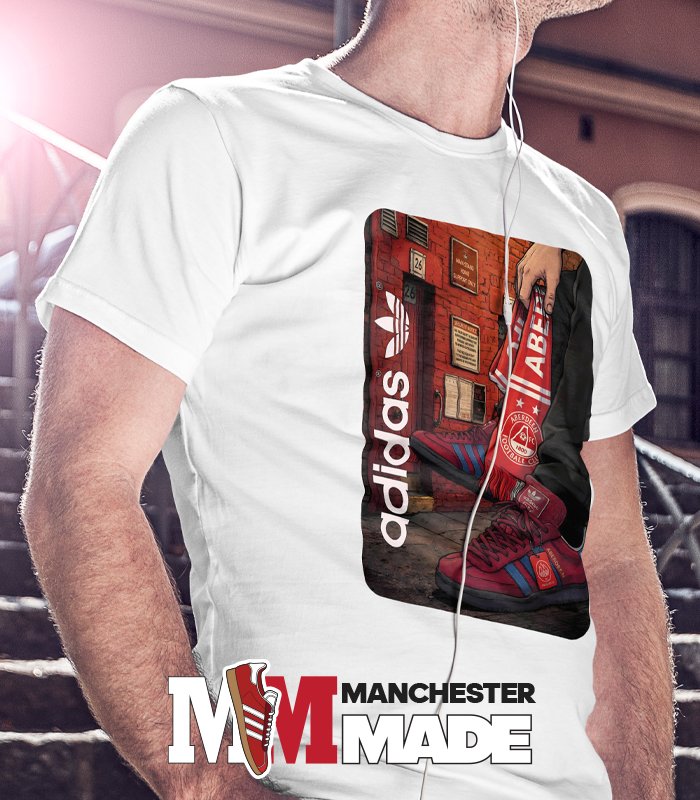 Adidas Aberdeen Trainer T-shirt. This striking image features an enthusiastic supporter, proudly showcasing a pair of the iconic Adidas Aberdeen trainers