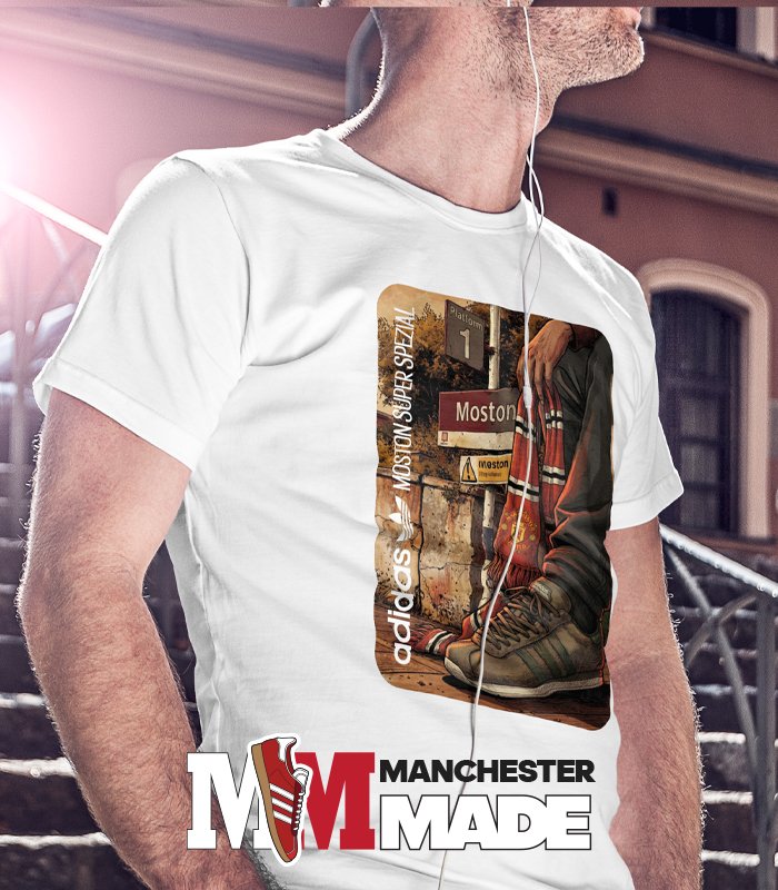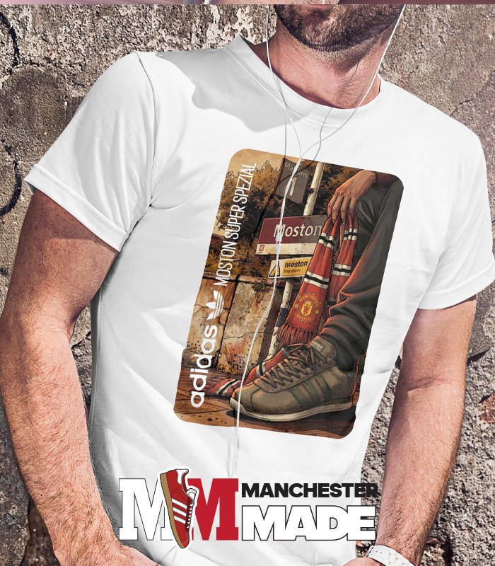 The Adidas Moston SPZL trainer t-shirt design captures the essence of urban culture and sports enthusiasm in a single striking image. Picture a confident individual, effortlessly stylish in a pair of the iconic Adidas Moston trainers, seated at the historic Moston rail station. This setting evokes a sense of nostalgia and community spirit. In their hands, a vibrant Manchester United scarf waves proudly, symbolizing loyalty and passion for the game. This design doesn’t just represent footwear; it embodies a lifestyle that resonates with football fans and fashion aficionados alike. By wearing this t-shirt, you’re not merely making a fashion statement; you’re embracing a rich heritage that celebrates both sport and community. Elevate your wardrobe and showcase your love for football and iconic style with this must-have piece that perfectly balances comfort, trend, and passion.