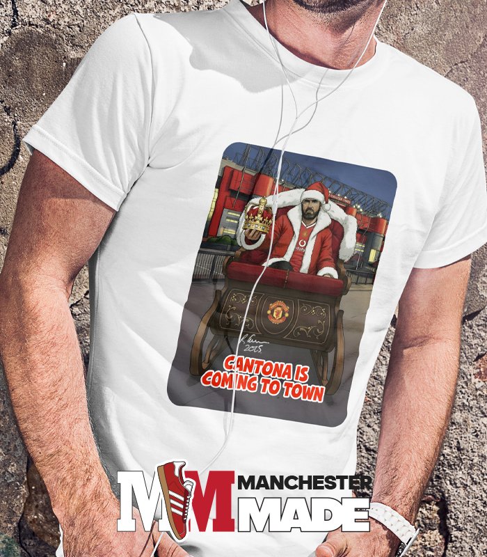 Introducing an exciting new t-shirt design that combines the magic of Christmas with the legendary spirit of football—featuring none other than Eric Cantona as Santa Claus! Picture this: the iconic French player, donned in a festive red suit, joyfully riding in a sleigh against the stunning backdrop of Old Trafford, the hallowed grounds of Manchester United. This captivating image is complemented by the playful text, “CANTONA IS COMING TO TOWN,” a clever nod to the beloved Christmas classic “Santa Claus Is Coming to Town.” This unique design cleverly merges holiday cheer with a celebration of football culture, making it the perfect gift for both passionate fans and festive enthusiasts alike. Not only does it showcase your love for the beautiful game, but it also captures the nostalgia and joy of the holiday season. Embrace the spirit of camaraderie and festivity; grab this one-of-a-kind t-shirt and let everyone know that the true spirit of Christmas is descending upon us—courtesy of the King himself, Eric Cantona!