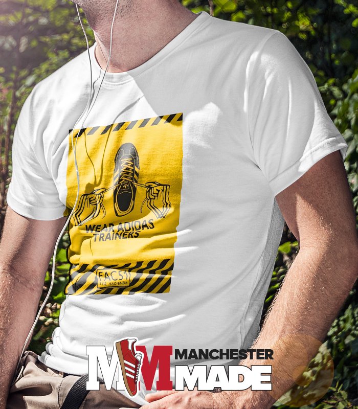 Introducing the adidas Haçienda Poster T-Shirt Design, a creative tribute to the iconic ‘USE HEARING PROTECTION’ logo sticker crafted by Peter Saville in 1978 for Factory Records. This emblematic design played a pivotal role in shaping the aesthetic of Factory, particularly within the legendary Haçienda nightclub.