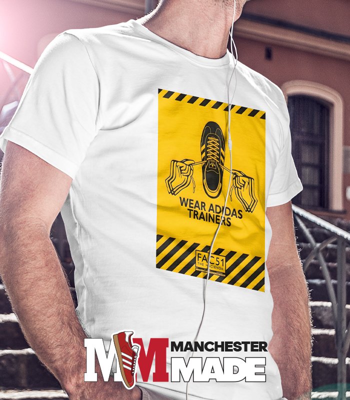 Before the Haçienda opened its doors, the vibrant Factory scene kicked off at The Russell Club in Moss Side. The ‘Use Hearing Protection’ motif quickly became a defining element of Factory’s artistic identity. Our reimagined designs take inspiration from this iconic symbol, but with a fresh twist. Instead of fingers plugging ears, our artwork depicts fingers holding the laces of an adidas sneaker. Additionally, where the original design featured the phrase “USE HEARING PROTECTION,” our interpretation boldly states “WEAR ADIDAS TRAINERS.”