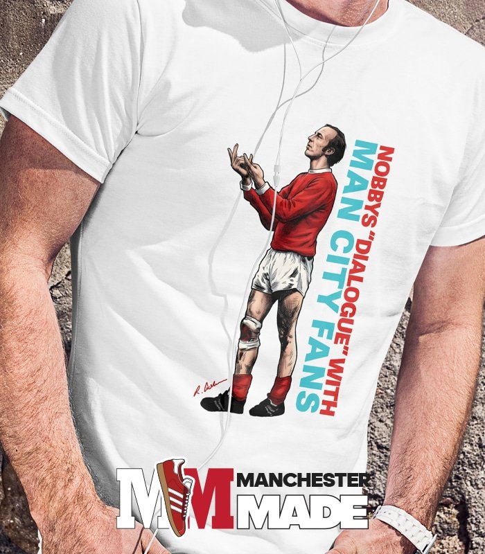 **A T-Shirt Design Featuring Nobby Stiles: A Bold Gesture Towards Rival Fans**