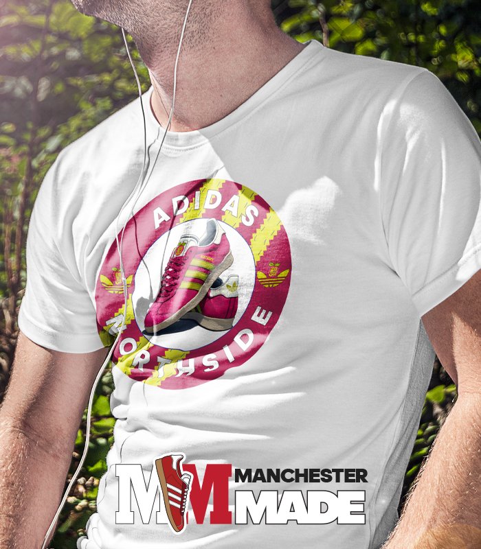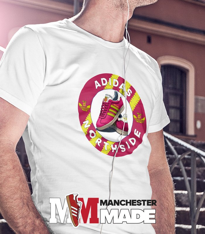 Presenting the Adidas Northside Trainers T-Shirt, a must-have for dedicated enthusiasts. This distinctive tee features a meticulously hand-drawn illustration of the Adidas Northside trainers, elegantly centered within a captivating circular design. This piece pays tribute to Northside, the iconic band hailing from Blackley and Moston in north Manchester. Designed for those who cherish the blend of music, fashion, and athletics, this t-shirt transcends ordinary apparel—it’s a heartfelt homage. Enhance your wardrobe with this exclusive item and proudly display your loyalty. The trainer depicted at the center is a fictional Adidas model, adorned in the band’s signature colors, complete with the iconic apple image featured on the trainer’s tongue.