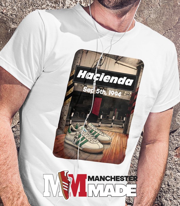 Imagine wearing a t-shirt that beautifully encapsulates the vibrant energy of the Hacienda, a legendary nightclub that was the heartbeat of Manchester’s music scene in the late 1980s and early 1990s, while simultaneously paying homage to the iconic Adidas LG trainers. This striking design would feature the unmistakable silhouette of the trainers nestled within the Hacienda’s iconic architecture, creating a seamless blend of fashion and nostalgia. Adding the date of the unforgettable Oasis gig at the Hacienda, this shirt would not only serve as a stylish piece of memorabilia but also as a conversation starter, a way to connect with fellow music enthusiasts and sneakerheads alike. By wearing this unique design, you proudly celebrate the rich cultural heritage of Manchester, showcasing your love for music, fashion, and history. Don’t miss the opportunity to own a piece of art that tells a story, commemorating an era where rhythm and style collided in the most spectacular way.